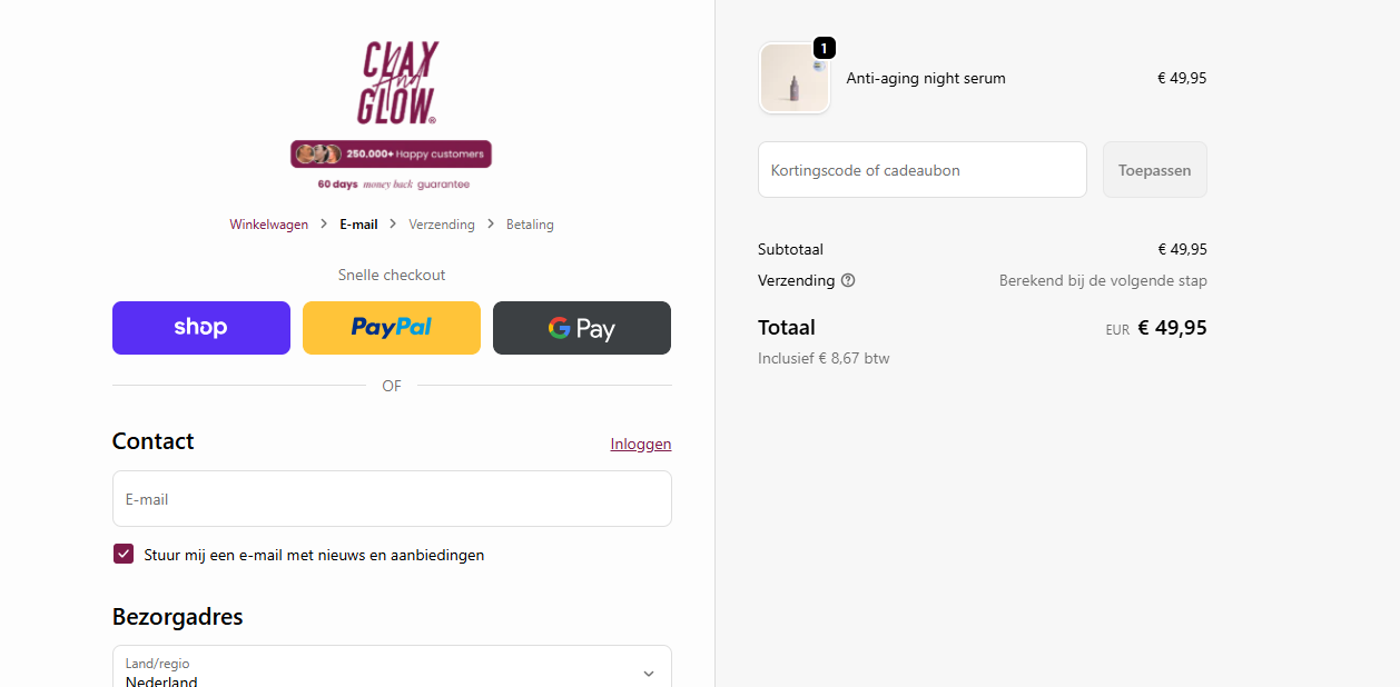 - Voeg je product toe Kies je favoriete Clay And Glow product zoals het Anti-aging Night Serum, selecteer het juiste item en voeg het direct toe aan je winkelwagen.