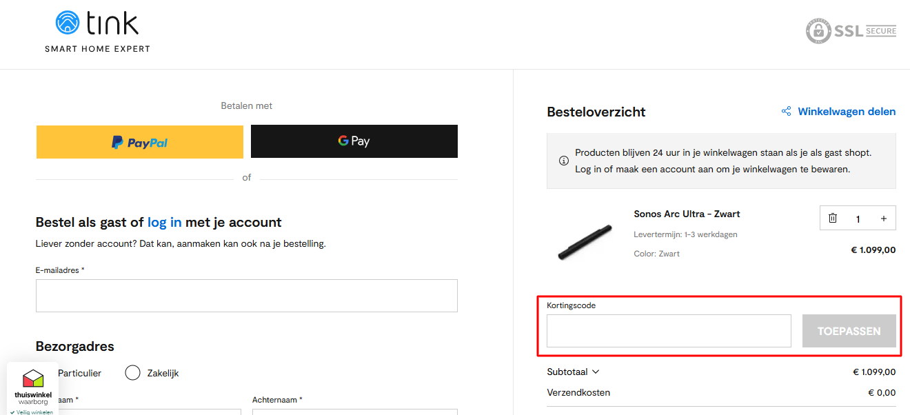 Stap 3 — Voer je Tink kortingscode in Aan de rechterkant van het besteloverzicht zie je een tekstbalk. Kopieer je kortingscode en plak hem precies in dat veld. Klik daarna op "Toepassen" om de korting te activeren.
