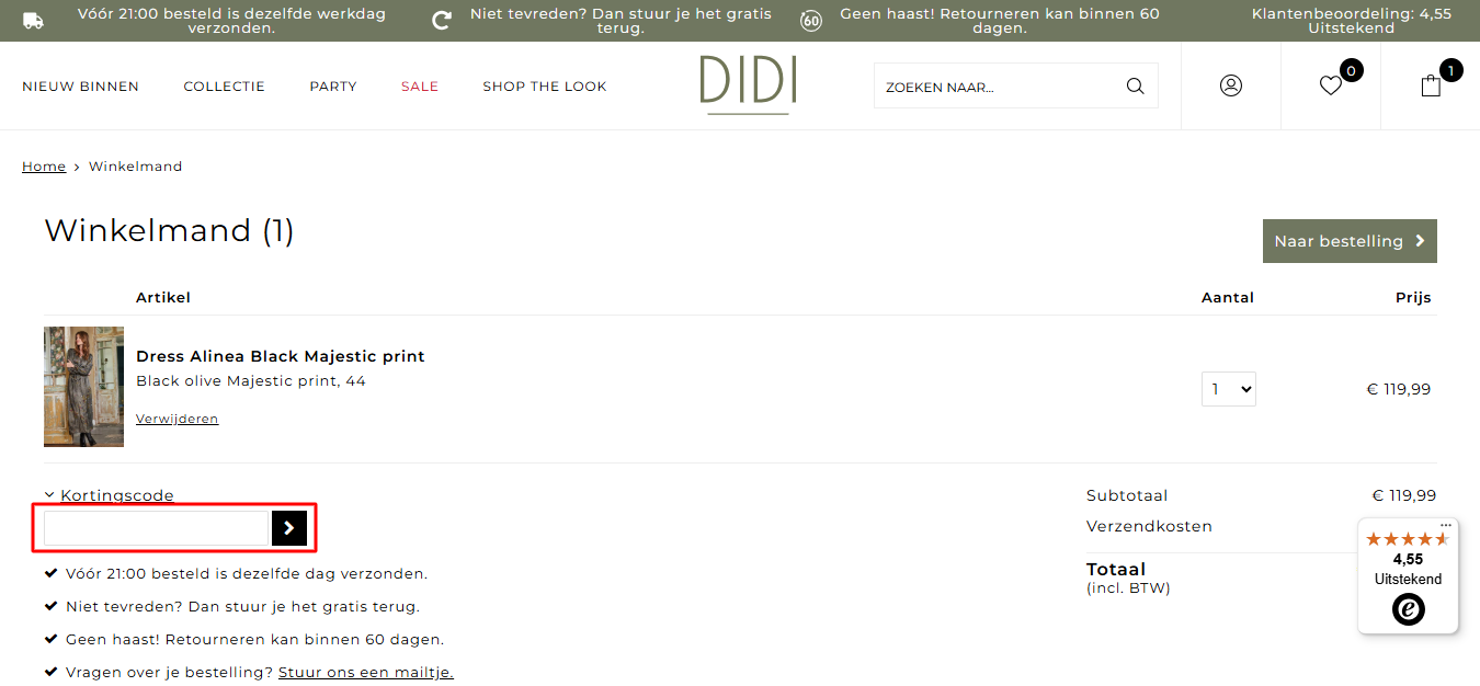 5. Plak hier je Didi kortingscode en bevestig deze door op de pijl of toepas-knop te klikken. De korting wordt direct verrekend in het totaalbedrag.