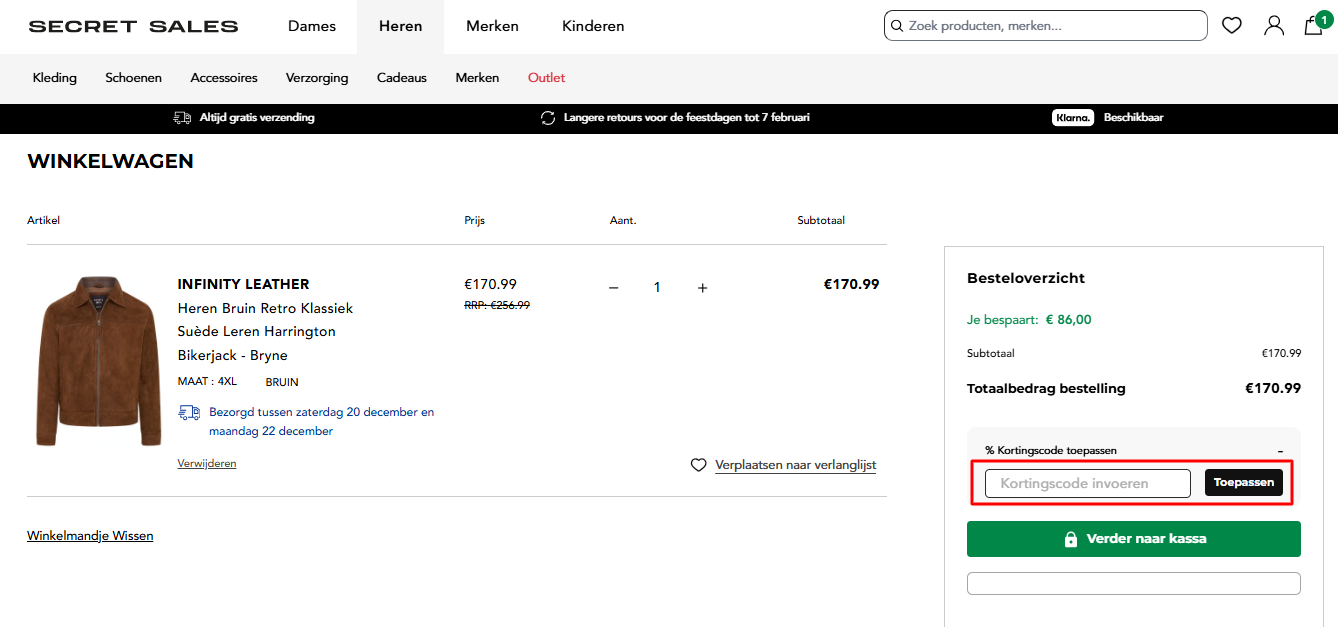 5. Onder het overzicht met betaalmethoden vind je de optie ‘Kortingscode toepassen’. Klik hierop om het invoerveld te openen. Kopieer vervolgens je Secret Sales kortingscode, plak deze in het vak en bevestig door op ‘Toepassen’ te klikken. De korting wordt direct verwerkt in het totaalbedrag van je bestelling.